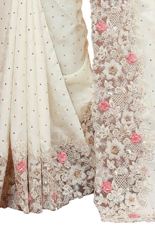 Cream Heavy Sequence Coding Embroidered Border Work Satin Silk Saree Sari For Women and Girls with Attach Blouse Piece