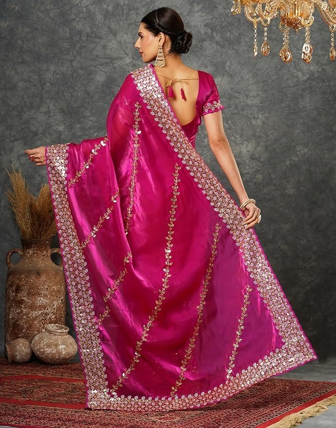 Women’s Tissue Silk Sequence Embroidery Scalloped Border Saree With Unstitched Blouse Piece